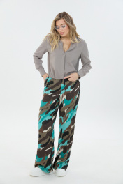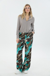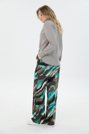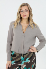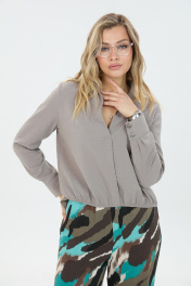 Комплект 2ка, состоящий из блузки и брюк. Блузка свободного силуэта с ассиметричным низом - спереди короче,сзади длиннее. Вырез горловины V-образный, воротник рубашечного типа. По низу переда блузки вставлена резинка. Манжеты с застёжкой на две пуговицы. Брюки прямого силуэта с карманами и резинкой по талии.