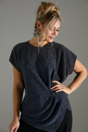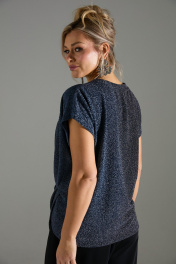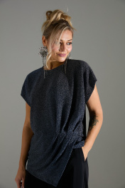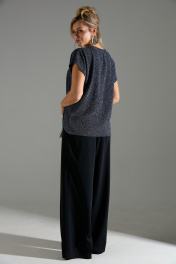 Костюм 2ка, состоящий из джемпера и брюк. Джемпер свободного силуэта с короткими цельнокроеными рукавами и оригинальным кроем. Низ джемпера ассиметричный. Брюки широкого объема, прямого силуэта. В боковых швах расположены карманы. Застежка-гульфик. Пояс отрезной, притачной. В задней части пояса вставлена эластичная тесьма (резинка). Пояс застегивается на петлю и крючок.