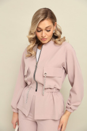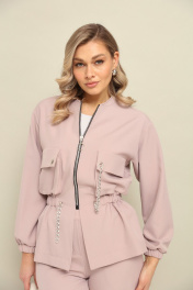 Костюм 2ка, состоящий из кофты и брюк. Кофта в спортивном стиле на молнии. Талия и низ рукавов на резинке. По переду расположены накладные карманы с клапанами. На клапанах люверсы. Жакет дополнен декоративными цепочками. Свободные брюки прямого силуэта, талия на резинке. В боковых швах расположены карманы. На правой брючине расположен боковой накладной карман с клапаном. Длина бомбера по спинке 63-65 см .Длина брюк по боковому 114-115 см.