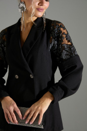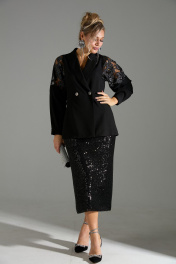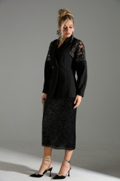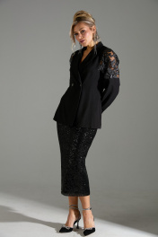 Комплект 2ка, состоящий из жакета и юбки. Двубортный жакет полуприлегающего силуэта с застёжкой на две пуговицы без карманов. Рукава жакета объёмные, заканчиваются манжетой с застёжкой на пуговицу. В качестве декора в районе плеча присутствуют вставки из кружевной ткани с пайетками. Юбка- карандаш длиной ниже колена прямого силуэта. Пояс юбки и подкладка выполнены из эластичного трикотажа. Верхний слой юбки из лёгкой ткани расшитой пайетками. Застёжка на потайную молнию в среднем шве по спинке, разрез расположен внизу среднего шва.