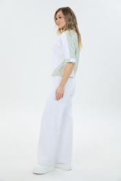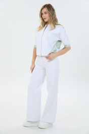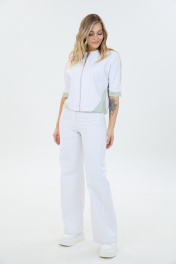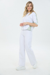 Костюм 2ка, состоящий из джемпера и брюк. Джемпер на молнии свободного силуэта из ткани двух видов. Рукава цельнокроеные чуть ниже локтя с имитацией манжеты. Джемпер облегченный, без подкладки и карманов, по низу на резинке. Брюки умеренного объёма прямого силуэта, талия на резинке. В боковых швах расположены карманы с наклонным входом.