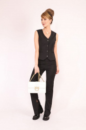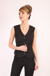 Женский жилет прилегающего силуэта. На полочках нагрудные вытачки переведены в рельефы и линию кармана. Карманы прорезные в рамку. На спинке плечевые вытачки и рельефы. В рельефах, на уровне талии два хлястика с застежкой на полукольца. По низу детали спинки фигурный вырез. Жилет на подкладке. Застежка центральная на четыре петли и пуговицы. Длина жилета до уровня бедер. У жилета высокая линия проймы, что позволяет носить его как отдельный элемент, без нижнего слоя одежды. Рекомендуем надевать под низ только вещи из тонких материалов (шифон, рубашечный хлопок и т.п.). Фурнитура и материалы отделки могут незначительно отличаться от тех, что на фотографии.