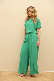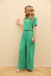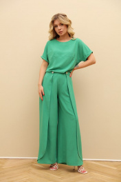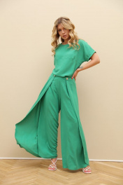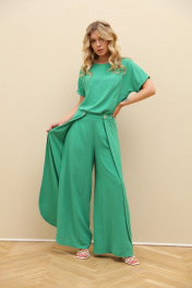 Комплект 2-ка из лёгкой ткани, состоящий из блузки и брюк. Блузка свободного объёма с короткими цельнокроеными рукавами с подворотами. Вырез горловины круглый. По переду подрез ниже линии груди. Широкие брюки-кюлоты свободного оригинального кроя с застёжкой на пуговицы. Без карманов. Фурнитура и материалы отделки могут незначительно отличаться от тех, что на фотографии Рост фотомодели 169 см. Размер у фотомодели – 44.