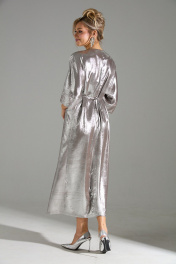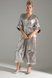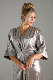 Платье большого объёма с цельнокроеными рукавами. По переду расположены 2 тесьмы из основной ткани, который завязываются на запах, что позволяет регулировать обхват талии.