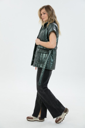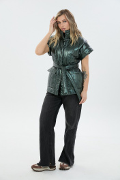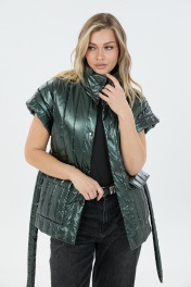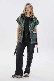 Жилет свободного силуэта из объемной стеганой ткани. Жилет на подкладке. Спущенная линия плеча, застёжка на кнопки. По переду широкие накладные карманы с клапаном с боковым входом для удобства. В комплекте идёт пояс из основной ткани. Длина по спинке 71-73 см.