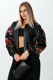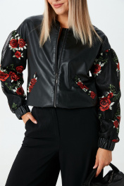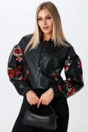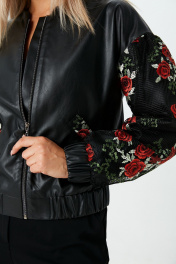 Бомбер из экокожи с объёмными рукавами и застёжкой на молнию. Манжеты и низ бомбера на резинке. Карманы и рукава бомбера декорированы сеткой с цветочной вышивкой.