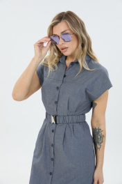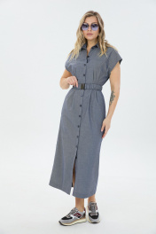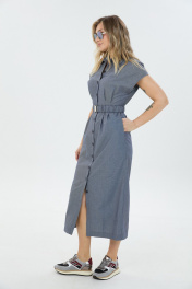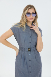 Платье умеренного объёма со спущенной линией плеча длиной ниже колена. Застёжка по переду на петли и пуговицы переходящая в разрез. Воротник отложной. По талии съёмный эластичный пояс.