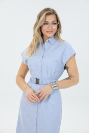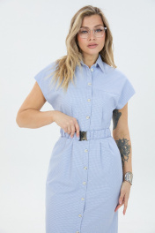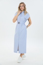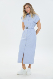 Платье умеренного объёма со спущенной линией плеча длиной ниже колена. Застёжка по переду на петли и пуговицы переходящая в разрез. Воротник отложной. По талии съёмный эластичный пояс.