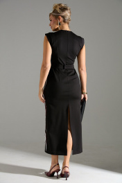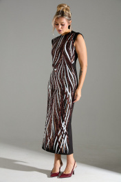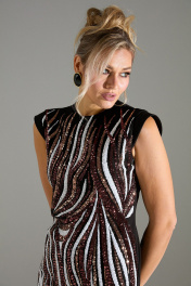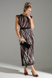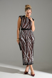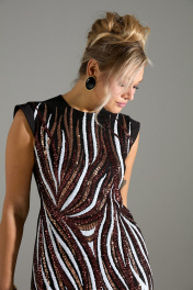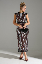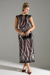 Платье приталенного силуэта выполнено из плотного трикотажного полотна. Перед платья декорирован сеткой с вышивкой из пайеток. По спинке расположены талиевые вытачки. По среднему шву спинки разрез длинной 56 см и застежка на потайную молнию. Горловина и пройма обтачные, рукав выполнен в виде небольшого "крылышка". В комплекте к платью идет пояс из основной ткани. Длина по спинке 132-138 см.