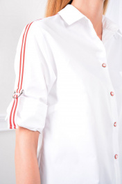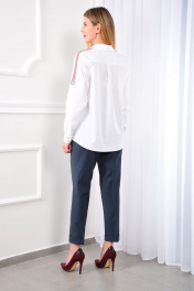 Женская белая рубашка – неизменная и универсальная классика. Особый вид модели придают контрастные лампасы на рукавах. Воротник рубашечного типа, стояче-отложной. Застёжка центральная на петли и пуговицы по планке. Полочки с нагрудными выточками. Полочку дополняет накладной карман. Рукав втачной длинный, низ рукава оформлен притачной манжетой на две пуговицы. С помощью двухцветной ленты, нашитой вдоль рукава, рукав можно сделать 3/4. Замеры: Рост фотомодели 166 см. Размер у фотомодели – 42. Изделие подойдёт для роста 170 см. Таблица обмеров изделия, см РАЗМЕР 42 44 46 48 50 52 54 56 Обхват груди 98 100 102 105 109 112 115 118,5 Обхват талии 98 100 102 105 108 110 114 117 Обхват бедер 106 107 109 112 116 116 122,5 122,5 Длина изделия 65 65 65 65 65 65 65 65 Длина рукава 60 60 60 61 61 61 62 62