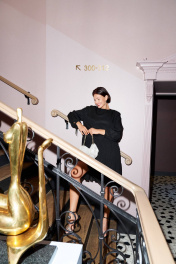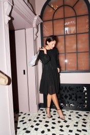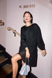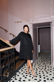Платье свободного кроя. Рукав спущенный, по низу рукава вставлен шифон в бархатный горох и застёжка на завязки. По низу платья притачные воланы из отделочной ткани шифон на сборку. По спинке средний шов и застёжка на завязку. К платью прилагается юбка прямого силуэта из подкладки, по талии на резинке Длина платья по спинке: 100 см Длина спущенного рукава: 53 см (плечо 21 см) ОГ: 108-112-116-120 см (размер 44-46-48-50) ОБ: 112-116-120-124 см (размер 44-46-48-50)