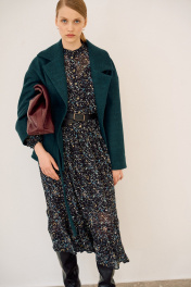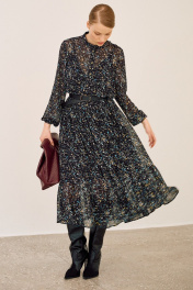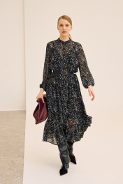 Шифоновое платье, которое идеально подойдёт для создания лёгкого многослойного образа. Платье состоит, из двух слоёв. Верхний слой выполнен из нежного шифона, нижний - это комбинация из трикотажной лёгкой подкладки. Платье свободного кроя «А»-силуэта с втачным длинным рукавом, по низу рукава притачная манжета на застёжку петли и пуговицы. По горловине стойка, по переду притачная планка, застёжка центральная на петли и пуговицы. К нижней части лифа платья ярусами нашиты воланы в сборку. В комплект входит кожаный ремень. Платье: Длина по спинке от высшей точки горловины: 128 см Длина рукава: 61 см ОГ: 96-100-104-108-112 см (размер 42-44-46-48-50) ОТ: 100-104-108-112-116 см (размер 42-44-46-48-50) Комбинация: Длина изделия: 83 см ОГ: 86-90-94-98-102 см (размер 42-44-46-48-50) ОТ: 82-88-92-96-100 см (размер 42-44-46-48-50) ОБ: 96-100-104-108-112 см (размер 42-44-46-48-50)
