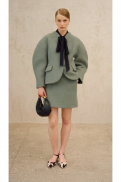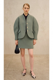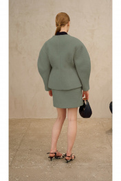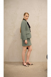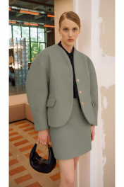 Комплект состоит из полупальто и юбки. Полупальто полуприлегающего силуэта на подкладке. Линия плеча спущена, рукав фигурной формы. Цельнокроеный воротник, переходящий в центральную застежку на потайные кнопки. По переду прорезные карманы с отлетными клапанами. По спинке средний шов и рельефы. Юбка в длине мини, прямого силуэта, на обтачке. По бокам прорезные карманы. По спинке средний шов, переходящий в потайную молнию. Полупальто: Длина по спинке от высшей точки горловины: 64 см; Длина рукава от горловины: 74 см; ОГ: 100-104-108-112 см (размер 42-44-46-48); ОТ: 94-98-102-106 см (размер 42-44-46-48); Юбка: ОТ: 76-80-84-88 см (размер 42-44-46-48); ОБ: 102-106-110-114 см (размер 42-44-46-48); Длина: 43,5 см