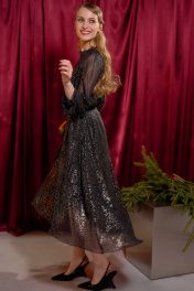 Платье длины миди А-силуэта выполнено из шифона, по переду и спинке на подкладке. Широкий длинный рукав-реглан. По низу рукава прошита резинка в несколько рядов. Горловина с невысокой стойкой на сборку. По переду средний шов, у основания шеи переходящий в застёжку на навесной крючок. Низ платья ассиметричный. Пояс входит в комплектацию. Длина платья по спинке от высшей точки горловины: 130 см Длина рукава: 72 см ОГ: 104-108-112-116 см (размер 46-48-50-52)