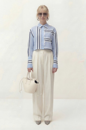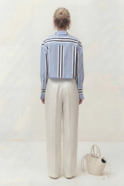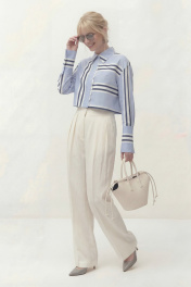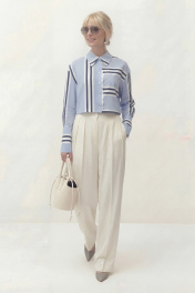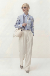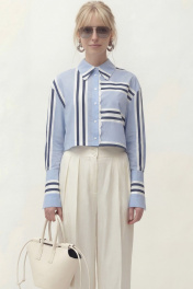 Блуза свободного кроя, укороченная, из хлопковой ткани в полоску. Рукав длинный, спущенный, по низу рукава приточная манжета на застежку петли и пуговицы. Воротник рубашечного кроя с отрезной стойкой. Центральная застежка на петли и пуговицы. Блуза: Длина по спинке от высшей точки горловины: 50 см Длина рукава от горловины: 75 см ОГ: 110-114-118-122 см (размер 42-44-46-48)