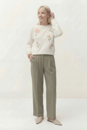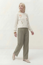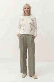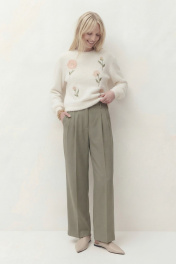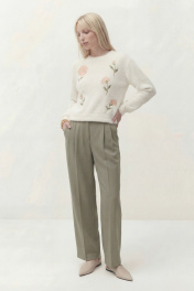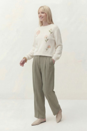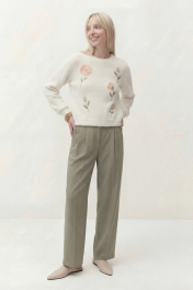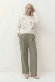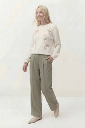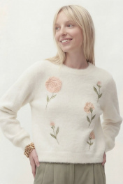 Джемпер свободного кроя, линия плеча спущена. По низу рукава манжета. Округлый вырез горловины с притачной бейкой, по низу джемперы притачная планка. По переду выполнена вышивка. Длина по спинке от высшей точки горловины: 53 см Длина рукава от горловины: 51 см ОГ: 106-110-114-118-122-126 см (размер 42-44-46-48-50-52)
