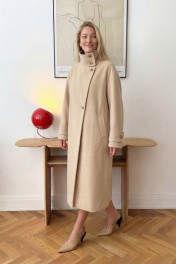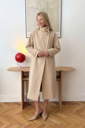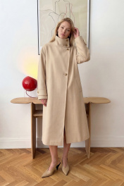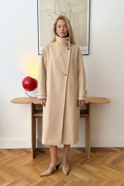Пальто свободного кроя в стиле оверсайз, на подкладке. Линия плеча спущена, рукав длинный, по низу рукава отлетная пата на пуговицу. Воротник стойка, застёжка двубортная на петли и пуговицы, в боковых швах карманы. По спинке средний шов и кокетка. Пальто: Длина пальто по спинке от высшей точки горловины: 120 см Длина рукава от горловины: 73 см ОГ: 122-126-130-134-138 см (размер 42-44-46-48-50)