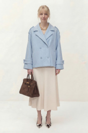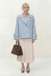 Укороченное двубортное пальто свободного кроя. Широкий английский воротник с заостренными лацканами. Застежка на два ряда пуговиц. Рукав реглан на манжете с пуговицой. На плечах элементы напоминающие погоны. Длина пальто по спинке от высшей точки горловины: 67,5 см Длина рукава от горловины: 72 см ОГ: 118-122-126-130-134 см (размер 44-46-48-50-52)