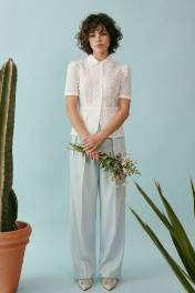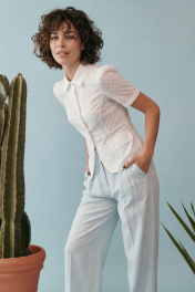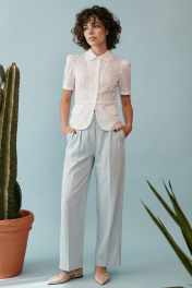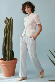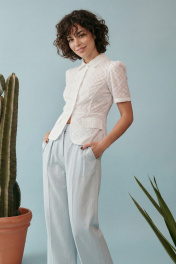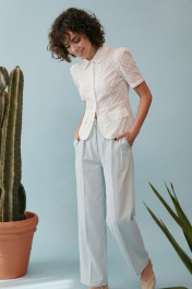 Элегантный полуприлегающий жакет, в котором сочетаются мягкость линий и четкая архитектура силуэта. Модель подчеркивает талию и формирует женственный, собранный образ с легким ретро-настроением. Жакет выполнен из хлопковой ткани ришелье, без подкладки. Рукав короткий со сборкой по окату. Классический рубашечный воротник на стойке, застёжка центральная на петли и пуговицы. По переду вертикальные рельефы, линия талии отрезная с притачной баской, которая мягко раскрывается к низу, создавая баланс между структурой и легкостью. По баске декоративные клапаны по бокам. По спинке: средний шов, рельефы и баска. Жакет легко комбинируется с брюками в тон, формируя современный костюм с утонченной эстетикой. Жакет: Длина по среднему шву спинки от основания горловины: 58 см ОГ: 86-90-94-98-102 см (размер 42-44-46-48-50) ОБ: 97-101-105-110-114 см (размер 42-44-46-48-50) ОТ: 80-84-88-92-96 см (размер 42-44-46-48-50) Обхват плеча: 36-38-40-42-44 см Длина рукава: 30 см