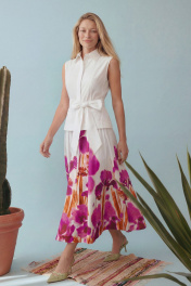 Платье с имитацией блузы и юбки выполнено из плотного хлопкового поплина с небольшим добавлением эластана для улучшения посадки. Блуза в платье до середины бедра, по переду рельефы выходят из проймы и уходят в линию низа блузы, по бокам не функциональные карманы-листочки. Линия плеча естественная, косая, без рукавов. Воротник стояче-отложной с острыми концами, рубашечного типа на отрезной стойке. Застежка центральная на петли и пуговицы. Юбка в платье со сборкой пришита к низу блузы платья. В боковых швах функциональные карманы. По спинке средний шов и вертикальные рельефы, по юбке купонный принт. Крупный флоральный рисунок расположен по нижней части изделия, плавно переходя в белый фон к линии талии. Главным декоративным элементом является художественный принт на юбке и широкий пояс из основной ткани, завязанный на пышный бант, эффектно подчеркивающий талию. Длина (по центру спинки от основания горловины): 135см ОГ: 92-96-100-104-108 см (размер 42-44-46-48-50) ОТ: 86-90-94-98-102 см (размер 42-44-46-48-50) ОБ: 106-110-114-118-122 (размер 42-44-46-48-50)