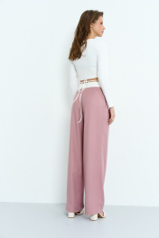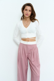 Укороченный джемпер из трикотажной хлопковой ткани с V-образным вырезом. Стяжка лифа по центру регулируется шнурком. Длина изделия по спинке 37 см, Длина изделия по боковому шву 19,5 см. Длина рукава 60 см.