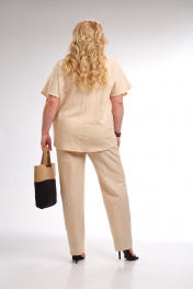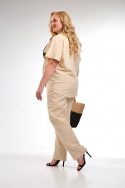 Костюм брючный двухпредметный. Выполнен из качественного белорусского льна. Брюки свободного кроя. Верх брюк обработан притачным поясом с резинкой, и боковыми карманами. Блуза свободного силуэта со спущенным рукавом. По переду выполнена дизайнерская аппликация: горловина окантована контрастной бейкой. Длина по переду от плечевого шва- 70 см. Длина по центру спинки от горловины - 77 см. Длина брюк с учетом пояса- 108 см