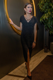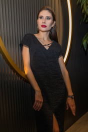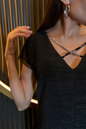 Платье прилегающего силуэта со спущенной линией плеча,V-образным вырезом горловины с декоративными цепочками и разрезом по центру