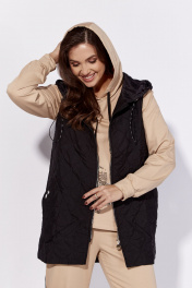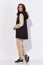 Комплект(жилет,свитшот и брюки).Жилет А-силуэта на подкладке с центральной застёжкой на тесьму-молнию,накладными карманами,с капюшоном.Свитшот прямого силуэта скапюшоном,печатью по переду.Брюки прямого силуэта зауженные к низу на резинке,по боковым швам-кант и частично резинка по низу. длина жилета-80см, длина брюк-98 см, длина свитшота-66см, длина рукава-62см