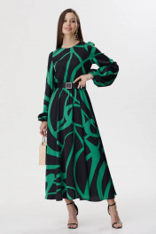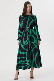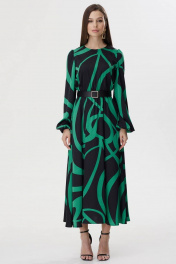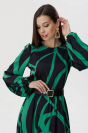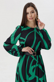Стильное платье полуприлегающего силуэта из плательной ткани с принтом. Горловина округлая. На спинке декоративный вырез с застежкой на петли и пуговицы. Рукав втачной, по окату сборка, по низу манжета на резинке. Платье отрезное по линии талии, в подрез вставлена резинка. В комплект входит съемный пояс. Обращаем ваше внимание, что фурнитура может незначительно отличаться от фото.