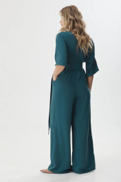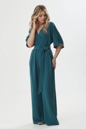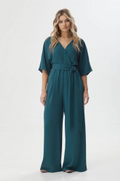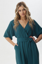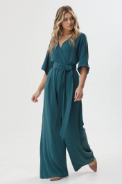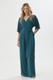 Нарядный комбинезон полуприлегающего силуэта с расширенными книзу брюками из струящейся ткани. Комбинезон отрезной по линии талии на резинке, верхняя часть комбинезона на запах. Рукав цельнокроеный длиной до локтя. По спинке V-образный вырез, в среднем шве центральная застежка на потайную молнию. В боковых швах карманы. В комплект входит пояс из основной ткани. Длина комбинезона: 158см Длина рукава: от горловины 27см