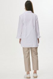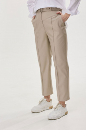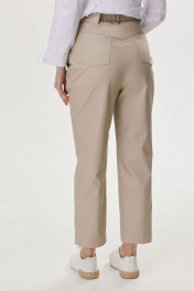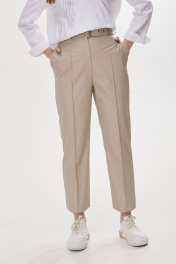 Классические брюки зауженные книзу из экокожи. По верху брюк притачной пояс и шлевки для ремня. Перед и спинка с отрезной кокеткой. На передних половинках брюк наклонные карманы и защипы, на задних – вытачки и накладные карманы. В среднем шве застежка на молнию и пуговицу. В брюки на поясе по спинке вставлена эластичная тесьма (резинка). В комплект входит съемный пояс. Обращаем ваше внимание, что фурнитура может незначительно отличаться от фото. Длина брюк: 99 см + 4.5 см пояс