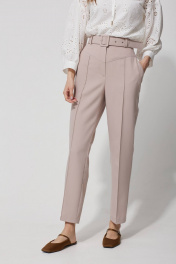 Классические брюки зауженные книзу из костюмной ткани с добавлением вискозы. По верху брюк притачной пояс и шлевки для ремня. Перед и спинка с отрезной кокеткой. На передних половинках брюк наклонные карманы и защипы, на задних – вытачки и накладные карманы. В среднем шве застежка на молнию и пуговицу. В брюки на поясе по спинке вставлена эластичная тесьма (резинка). В комплект входит съемный пояс. На задних половинках вытачки и декоративные карманы. В комплект входит съемный ремень. Обращаем ваше внимание, что фурнитура может незначительно отличаться от фото.