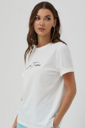 Комплект состоящий из футболки и сарафана Сарафан полуприлегающего силуэта расширенный книзу из джинсовой ткани. Верхняя часть сарафана ассиметричная. Сарафан отрезной по лини талии. В боковом левом шве потайная молния. По переднему полотнищу юбки складки, по заднему – вытачки. Майка женская прямого силуэта из комфортного трикотажного полотна, длиной до линии бедер. Горловина округлая. Рукав втачной. По переду дизайнерская печать. Длина футболки (44-48р - 61см); (50-54р - 62см) Длина рукава (44-48р - 23,5см); (50-54р - 24см) Длина сарафана от плеча (44-48р - 123см); (50-54р - 125см).