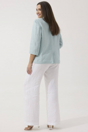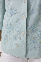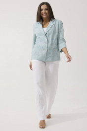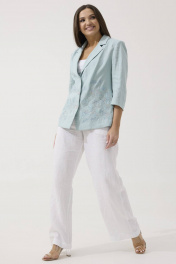 Нежный льняной жакет Ma Сhérie свободного силуэта на все случаи жизни. Воротник пиджачного типа, застежка центральная на три петли и пуговицы. Снизу полочки декоративная дизайнерская вышивка. Спинка со средним швом, который заканчивается шлицей, и талиевыми вытачками. Рукав двухшовный втачной, длиной 3/4. Длина изделия 64 см, длина рукава 46 см. Наш жакет смело можно надеть в офис, на семейное торжество или романтическое свидание. Будет идеально смотреться с нашими льняными брюками 2088 (на фото), также обе модели можно приобрести комплектом 3133.