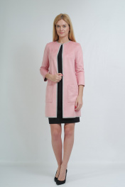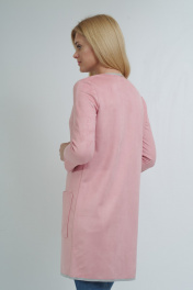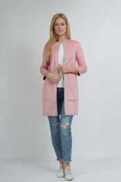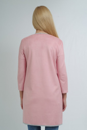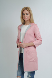 Стильный кардиган свободного кроя. Выполнен из мягкого двухслойного трикотажного полотна: лицевая сторона - под замш, внутренняя сторона - светло-серый меланж. Ткань очень легкая в уходе. Стирка и утюжка с изнаночной стороны. На уровне бедер, два накладных кармана. По горловине переда застечка на крючок, декорированный камнями. По краю борта, горловины и низу изделия декоративный застрочной припуск на лицевую сторону. Рукав втачной, длиной 3/4. Края рукавов обработаны таким образом, что смотрятся аккуратно с изнаночной стороны и могут быть подвернуты на нужную длину контрасной стороной. Кардиган универсальный. Он отлично сочетается с джинсами и станет ярким акцентом в сочетании с классическими юбками и брюками. Отлично дополнит вечерний образ. Длина изделия 84см