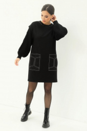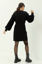 Стильное платье прямого кроя Выполнено из костюмно-плательной ткани. Приталено за счет съемного пояса, выполненного из основной ткани. Рукав вязаный, спущен. Оригинальное сочетание вязаного рукава и плательной ткани. Платье дополнено накладными боковыми карманами. По спинке застежка на потайную молнию. Длина платья от плечевого шва 93 см. Длина рукава 63см.
