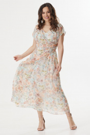Легкое платье полуприлегающего силуэта на трикотажной подкладке, с расширенной книзу юбкой. Выполнено из нежного струящегося шифона с цветочным принтом. Рукав цельнокроеный, короткий. Застежка по спинке на пришивную пуговицу. Спереди платье дополнено декоративным запахом с застежкой сбоку на пришивные пуговицы. Длина платья от плечевого шва 136см. Длина рукава 10см.