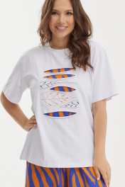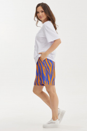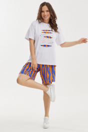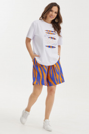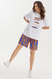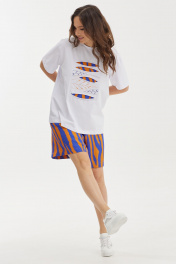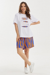 Летний комплект из футболки и шорт. Футболка свободного базового кроя. Дополнена оригинальной аппликацией и вышивкой. Рукав втачной, слегка спущен. Шорты свободного прямого кроя с притачным поясом, дополненным эластичной тесьмой. Ткань штапель. Дополнены боковыми карманами. Длина футболки от плечевого шва 65см Длина рукава 25см. Длина шорт по боковому шву 50см.