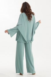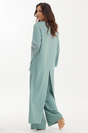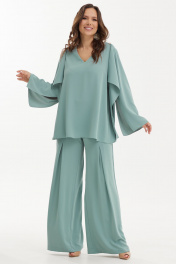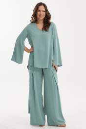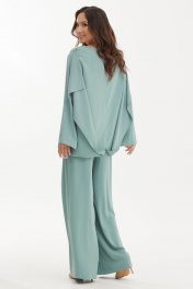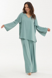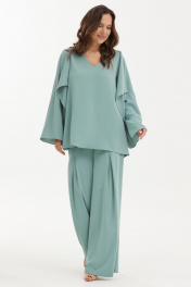 Шикарный нарядный комплект из оригинальной блузы с регуляцией длины спинки и брюк. Выполнен комплект из нежной струящейся ткани средней плотности. Блуза свободного кроя. Рукав втачной, слегка спущен, дополнен разрезом. Горловина с V-образным вырезом. Спинка с фигурным удлинением. За счет этого можно, при желании, менять длину спинки за счет крепления нижнего края блузы на пуговицу и петлю к плечу блузы. Так же можно оставить длину для создания при движении летящего, воздушного эффекта. Брюки прямого свободного кроя с притачным поясом, дополненным эластичной тесьмой. Застежка по боковому шву на потайную молнию и пуговицу. Брюки дополнены удобными карманами. По переду брюки дополнены защипами. Посадка брюк средняя Длина блузы от плечевого шва по переду 73см., по спинке 145см. Длина рукава 61см. Длина брюк по боковому шву 111см.2454