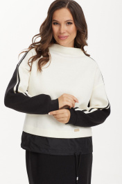 Стильный трикотажный костюм из джемпера и юбки. Выполнен из качественного, приятного к телу трикотажного полотна. Джемпер прямого свободного кроя. Рукав втачной, слегка спущен, дополнен притачной манжетой. Горловина -стойка цельнокроеная. Перед джемпера выполнен из белого трикотажа, спинка - из черного. Спереди джемпер дополнен притачной планкой с кулиской по низу. Юбка миди с боковым разрезом. По талии эластичная тесьма. Выполнена из черного трикотажа. Юбка дополнена из комфортной трикотажной подкладкой. Длина джемпера от плечевого шва 63см. Длина рукава60см. Длина юбки85см.