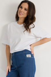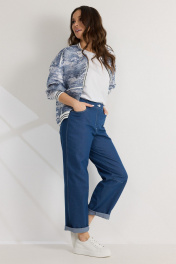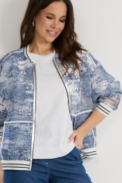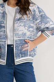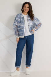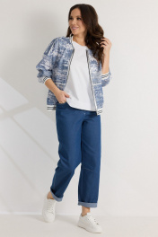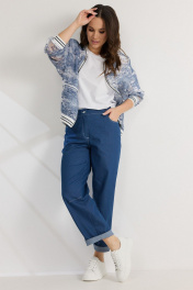 Стильный комплект из бомбера, футболки и брюк. Бомбер свободного кроя с центральной застежкой на стильную молнию. Выполнен из полупрозрачной органзы с джинсовым принтом. Горловина, низ бомбера и манжеты выполнены из притачного довяза. Бомбер дополнен боковыми карманами. Футболка прямого кроя. Рукав спущен. Выполнена из хлопкового трикотажного полотна. Брюки свободного кроя, слегка заужены книзу. Посадка средняя. Пояс притачной, дополнен эластичной тесьмой. Брюки дополнены удобными боковыми и задними карманами. Застежка гульфик на молнию и металлическую пуговицу. Выполнены из джинсовой ткани. Длина бомбера от плечевого шва 64см. Длина рукава 60см. Длина футболки от плечевого шва60см. Длина брюк по боковому шву 96см.