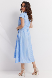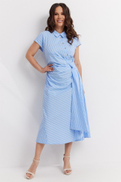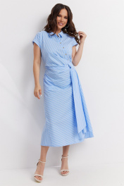 Стильное платье приталенного силуэта. Выполнено из хлопковой ткани. Рукав цельнокроеный, короткий. Горловина обработана отложным воротником. Центральная застежка выполнена с асимметрией, что придает платью уникальность. Низ платья расширен к низу. На талии оригинальная драпировка. Длина платья от плечевого шва 122см. Длина рукава 15см.