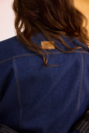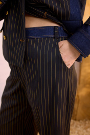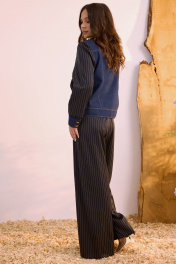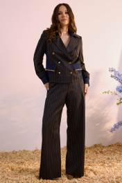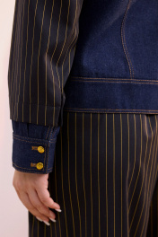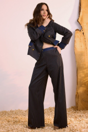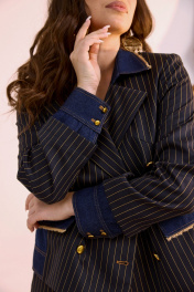 Стильный компект из жакета и брюк. Двубортный жакет выполнен из костюмной ткани в комбинации с темно-синим джинсом. Жакет на подкладке с застежкой на пришивные пуговицы. Рукав втачной, дополнен манжетой из джинса. Воротник отложной. Брюки классического прямого кроя с притачным поясом, выполненным из джинса, дополненным эластичной тесьмой. Посадка средняя. Дополнены удобными боковыми карманами. Застежка гульфик на молнию и пришивную пуговицу. Брюки выполнены из комфортной костюмной ткани. Длина жакета от плечевого шва 58см. Длина рукава 60см. Длина брюк по боковому шву 104см.