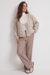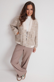Стильный комплект из бомбера, лонгслива и брюк. Бомбер свободного кроя, на подкладке, с центральной застежкой на красивые пуговицы. Выполнен из фактурной рогожки. Линия плеча слегка спущена. Горловина V-образная, обработана довязом. Бомбер дополнен функциональными боковыми карманами. Для придания легкого объема низ бомбера слегка присборен на эластичный довяз. Лонгслив прямого кроя выполнен из нежного трикотажа в рубчик. Рукав втачной. Горловина округлой формы. Брюки классического прямого кроя с притачным поясом, дополненным эластичной тесьмой. Посадка средняя. Дополнены удобными боковыми карманами. Застежка гульфик на молнию и пришивную пуговицу. Брюки выполнены из комфортной костюмной ткани. Длина бомбера от плечевого шва 63см. Длина рукава 61см. Длина лонгслива от плечевого шва 64см. Длина рукава 60см. Длина брюк по боковому шву 104см.