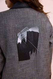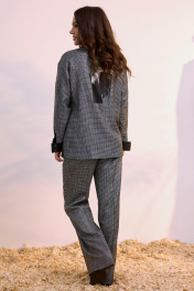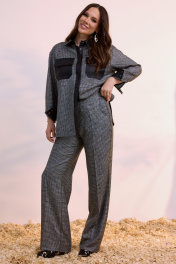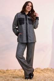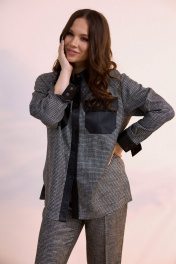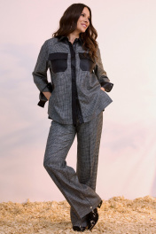 Стильный комплект из блузы и брюк. Выполнен из красивой костюмной ткани с отделкой из эко кожи премиум класса. Блуза рубашечного кроя с центральной застежкой на металлические кнопки. Рукав втачной, слегка спущен. Дополнен притачной манжетой с застежкой на кнопку. Блуза дополнена отделкой из мягкой эко кожи. Брюки классического прямого кроя с притачным поясом, дополненным эластичной тесьмой. Посадка средняя. Дополнены удобными боковыми карманами. Застежка гульфик на молнию и пришивную пуговицу. Длина блузы от плечевого шва 70см. Длина Рукава 60см. Ждлина брюк по боковому шву 104см.