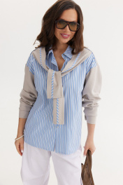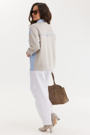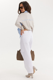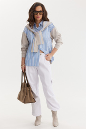 Стильный комплект из блузы и брюк. Блуза свободного рубашечного кроя, с центральной застежкой на пришивные пуговицы. Горловина обработана отложным воротником на стойке. Спинка и рукава выполнены из комфортного гладкого трикотажного полотна. Декоративный элемент на плечах, имитирующий завязанные рукава , придает образу непринужденный шарм и свежесть. Брюки свободного кроя с притачным поясом, дополненным эластичной тесьмой. Посадка средняя. Застежка гульфик на молнию и красивые пуговицы. Выполнены из белой джинсовой ткани. Оригинальные защипы в районе колена придают джинсам модный силуэт. С правой стороны имитация кармана. Джинсы имеют классическое расположение боковых и задних накладных карманов, дополненных хольнитенами. Длина блузы от плечевого шва 67см. Длина рукава 60см. Длина брюк по боковому шву 96см.