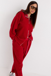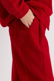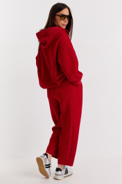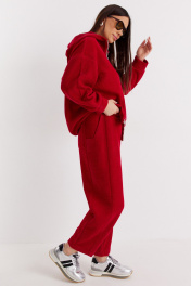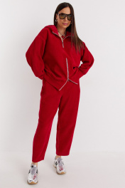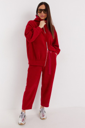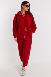 Стильный комплект из джемпера и брюк , выполненных из фактурного трикотажного плотна (штрукс) Джемпер свободного объемного кроя со спущенной линией плеча. Горловина укладывается в стойку и дополнена капюшоном. Оригинальные застежки на металлические молнии придают джемперу особый стиль. Брюки свободного кроя, слегка заужены книзу. Притачной пояс дополнен эластичной тесьмой. Брюки дополнены стильным поясом на полукольцах, и удобными боковыми карманами. По бокам оригинальные вставки из ткани. Длина спинки джемпера 68 см. Длина рукава 60см. Длина брюк 98см.