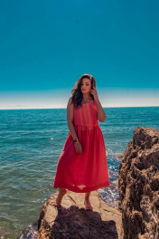 Платье отрезное по талии, расширенное к низу. Юбка присборенная, карманы в боковых швах. Горловина – каре с вышивкой. Без рукавов.