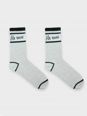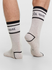 Носки мужские классические высокие с плотным бортом и рисунком в виде надписи "На чиле" - отличная возможность внести разнообразие и поднять настроение в праздники. Длинные мужские носки с принтом изготовлены из гребенного хлопка - пряжи высочайшегокачества, мягкой, тонкой, но прочной. Натуральные волокна отлично пропускают воздух, позволяя коже дышать, и впитывают влагу, дарят ощущение комфорта в течение всего дня. Благодаря небольшому количеству эластана в составе, носки хорошо облегают стопу и сохраняют форму даже после множества стирок. Мягкая эластичная резинка надежно удерживает носки на ноге, но не давит. Пятка и мысок дополнительно усилены, что гарантирует защиту от протирания и повышенную износостойкость - мужские носки с принтомпрослужат долго. Купить мужские носки недорого можно у нас на сайте или в магазине Mark Formelle. Отличный выбор на каждый день. Рекомендуем!