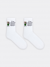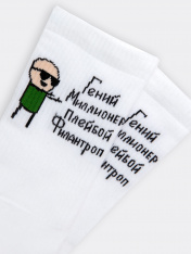 Высокие носки мужские с плотным бортом и рисунком в виде надписи "Гений, Миллионер, Плейбой, Филантроп" — отличная возможность внести разнообразие и поднять настроение в праздники. Изготовлены из гребенного хлопка — пряжи высочайшего качества, мягкой, тонкой, но прочной. Натуральные волокна отлично пропускают воздух, позволяя коже дышать, и впитывают влагу, дарят ощущение комфорта в течение всего дня. Благодаря небольшому количеству эластана в составе, длинные носки хорошо облегают стопу и сохраняют форму даже после множества стирок. Мягкая эластичная резинка надежно удерживает носки на ноге, но не давит. Пятка и мысок дополнительно усилены, что гарантирует защиту от протирания и повышенную износостойкость — мужские носки с принтом прослужат долго. Лучший выбор на каждый день. Рекомендуем!